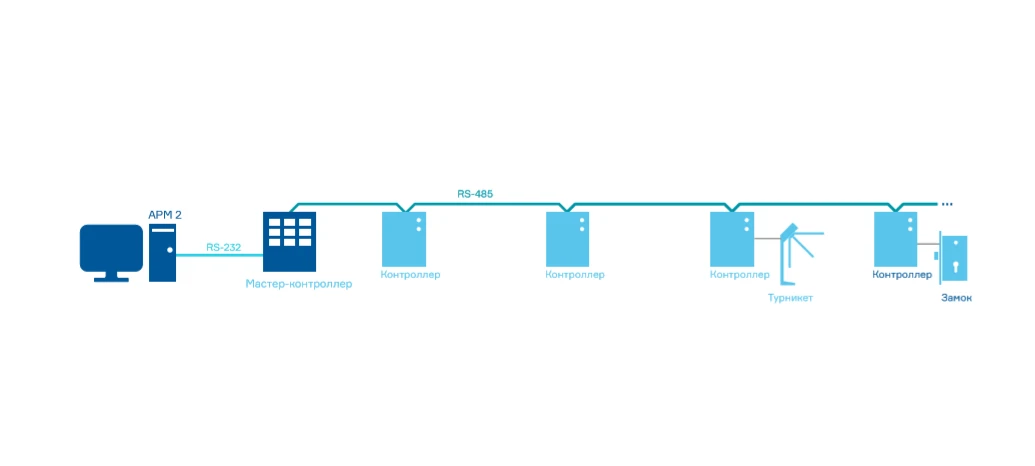 Давным-давно компьютерные сети еще были большой редкостью. И тогдашние СКУД строились следующим образом: мастер - контроллер обслуживал ограниченное количество контроллеров, а компьютер выступал в роли терминала для его программирования и отображения информации. Логику работы определял мастер-контроллер, управляющий вторичными контроллерами. Вторичные контроллеры не могли обмениваться информацией напрямую друг с другом, обмен происходил через мастер-контроллер. Такая модель накладывала значительные ограничения на развитие систем контроля доступа.