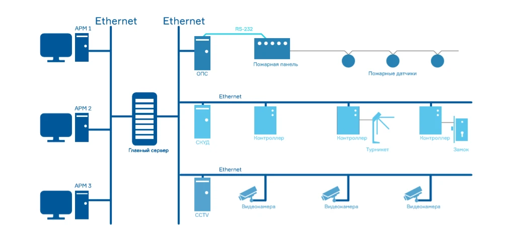 В такой модели программное обеспечение могло быть установлено в любом месте в пределах локальной сети, интеграция с другими системами безопасности упрощалась за счет использования единой среды обмена информацией.