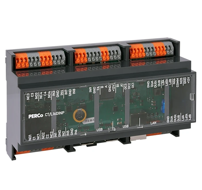 Универсальный контроллер CT/L16DINP предназначен для управления исполнительными устройствами: шлагбаумами, турникетами, замками. Работает в составе систем PERCo.